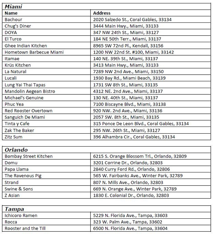 La categoría Bib Gourmand inicia su andadura con 29 establecimientos (19 en Miami, 7 en Orlando y 3 en Tampa). Los inspectores explican que son establecimientos que destacan por ofrecer una buena comida formada por dos platos y una copa de vino o un postre a un precio razonable, no supera los 49 dólares (unos 46’5 euros). A continuación podéis ver la lista de Restaurantes Bib Gourmand de Miami, Orlando y Tampa: