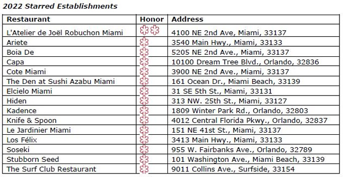La Guía Michelin Miami, Orlando y Tampa 2022 inicia su andadura con 15 restaurantes con estrella, resultado que según Gwendal Poullennec, director internacional de las Guías Michelin, refleja el talento de los cocineros y su equipo que trabaja para crear experiencias gastronómicas sorprendentes, combinando cocina internacional con los sabores propios de Florida.