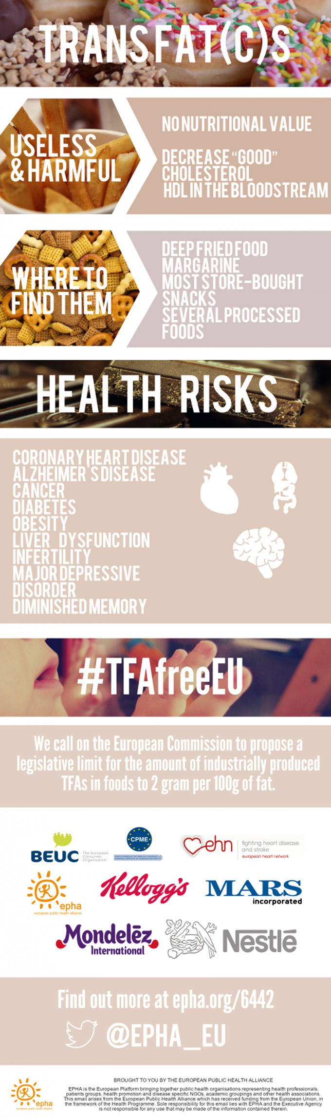 Con la intención de forzar a la Comisión Europea para que presente el informe y se ponga en marcha la reglamentación que limite o elimine el uso de las grasas trans, se ha enviado una carta abierta a la Comisión Europea firmada por Mondelez, Nestlé, Mars, Kellogg, la Sociedad de cardiología Europea, la EPHA (Alianza Europea de Salud Pública), la EHN (Red Europea del Corazón) y la BEUC, organización que representa y defiende los intereses y derechos de los consumidores europeos, para que se limite el contenido de ácidos grasos trans en los alimentos en un máximo de 2 gramos por cada 100 gramos de grasa, con el propósito de reducir el impacto negativo que estas grasas tienen en la salud.