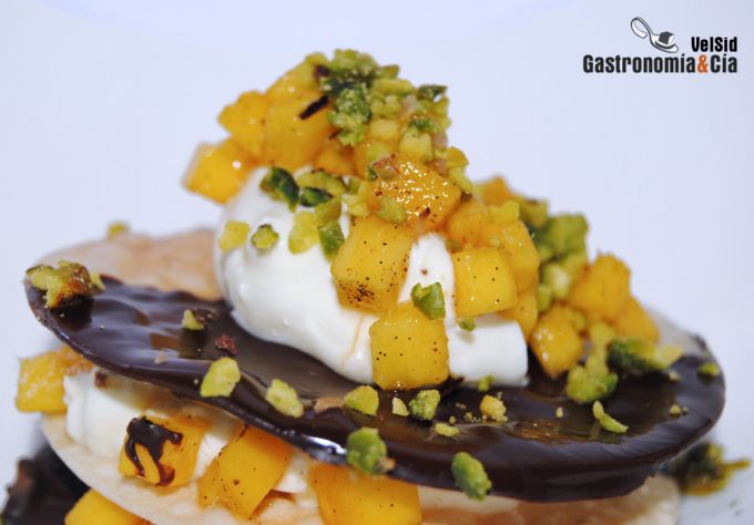 Coloca en la base del plato una oblea, a continuación una cucharada generosa de crema, otra cucharada de mango y vuelve a colocar otra oblea. Repite la operación para terminar coronando el postre con la crema, el mango y los pistachos verdes picados. Sirve enseguida estas Obleas de chocolate con mango y pistacho y ¡buen provecho!