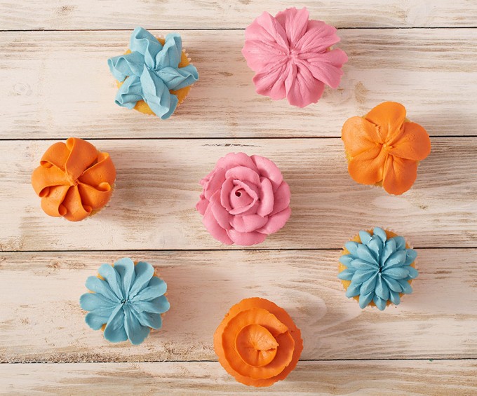 La boquilla es la 127 de Wilton, pero también sirven las que tengan la misma forma, o similar, y sean de otra marca. Con este tipo de boquilla para la manga pastelera se pueden hacer, entre muchas otras, las ocho decoraciones que podéis ver en la foto que ilustra estas líneas, son distintas formas de presentar un cupcake con la apariencia de una flor hecha con glaseado o icing decorador.
