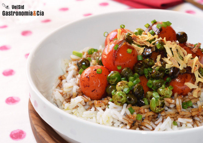 Arroz aromático con guisantes y tomates cherry salteados con tamari