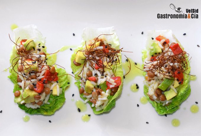 Ensalada de arroz basmati con cogollos, salmón y sésamo