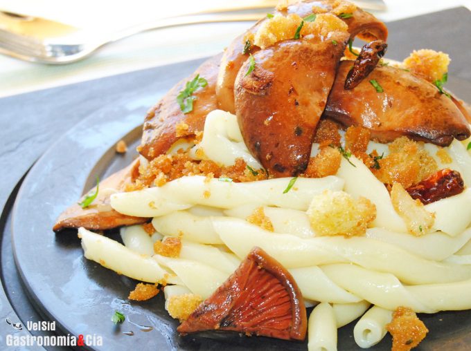 Pasta (fusilli al torchio) con níscalos y migas de pan