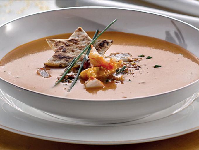 Para el entrante podremos elegir entre una Crema de Cigalas (300 ml), un Pastel de cabracho (200 gramos), una Ensalada de cangrejo (350 gramos) y unos Pimientos rellenos de marisco (200 gramos). Como plato principal se puede elegir entre una Pierna de cordero lechal de Castilla y León deshuesada, un Magret de pato nacional con salsa de higos y reducción de cassis (unos 250 gramos), un Bacalao al pil pil (375 gramos), y una Caldereta de rape con carabineros (300 gramos aproximadamente).