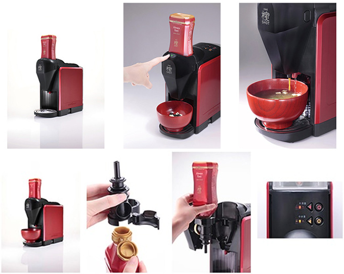 Pues esta máquina está a punto de ver la calle para el sector doméstico, el próximo 27 de enero de 2014 sale a la venta, finalmente bautizada como One Shot. Como podéis ver en la foto, tiene todo el aspecto de cafetera de cápsulas y funciona del mismo modo, proporciona el producto elaborado para el que se ha diseñado simplemente pulsando un botón. One Shot hace sopa de miso al instante.