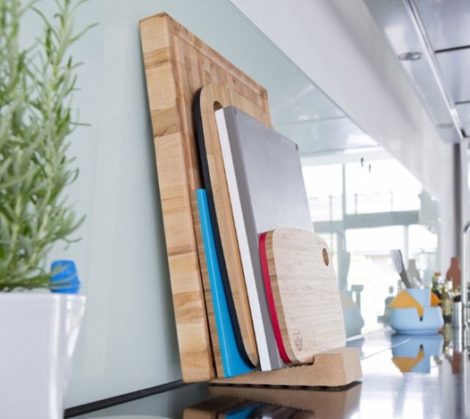 El problema puede ser guardar las tablas o tenerlas a mano cuando se necesitan, pues las cocinas domésticas estándar suelen ser pequeñas o al menos siempre nos falta espacio. Una solución para quienes tengan sitio en la encimera es disponer de este organizador de tablas de cortar, diseñado por Ivan Kasner y Uli Budde de Officeoriginair, y que se comercializa a través de Royal VKB.