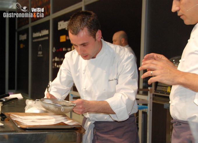 La siguiente demostración fue la del Tartar de tuétano con ostras, un plato definido como gourmet pero que visualmente era muy feo, así que deciden servirlo en una cáscara de ostra cubierto con un aire de la misma. El interior de la ostra contiene una cucharada de una elaboración de tuétano, que ha estado en agua y hielo durante dos días, después se ha blanqueado y se ha dejado enfriar. Añade unas ostras picadas y elabora con un poco de chalota, cebollino, salsa de mostaza, la grasa que suelta el tuétano… El comensal tomará este bocado sobre una hoja de ostra, podemos imaginar el golpe de mar en el que se traducirá en el paladar.