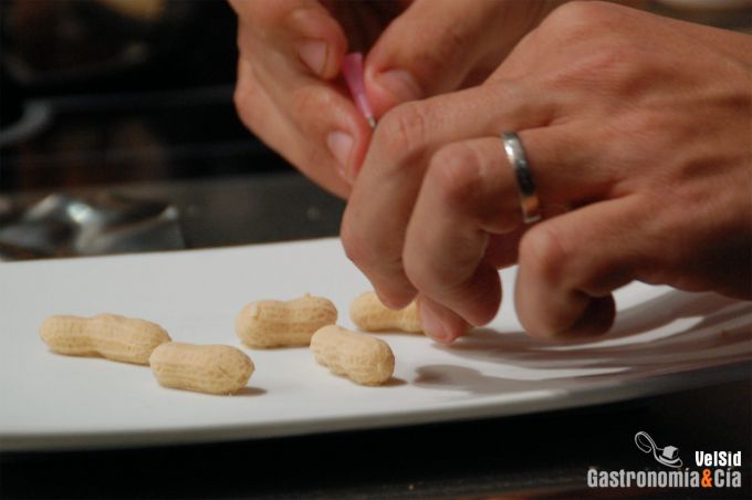 Continuamos con los Cacahuetes miméticos, como podéis ver en las fotos, a partir de una mezcla de agua, xantana, praliné de cacahuete y aceite virgen de cacahuete, hace una emulsión que se introduce en unos moldes con forma de cacahuete. La textura en el paladar será así, cremosa, pero también ofrecerá la textura crujiente de la cáscara que consiguen con un baño de manitol. Terminan los cacahuetes miméticos espolvoreando sal lustre y dejándolos reposar para que terminen de secarse.