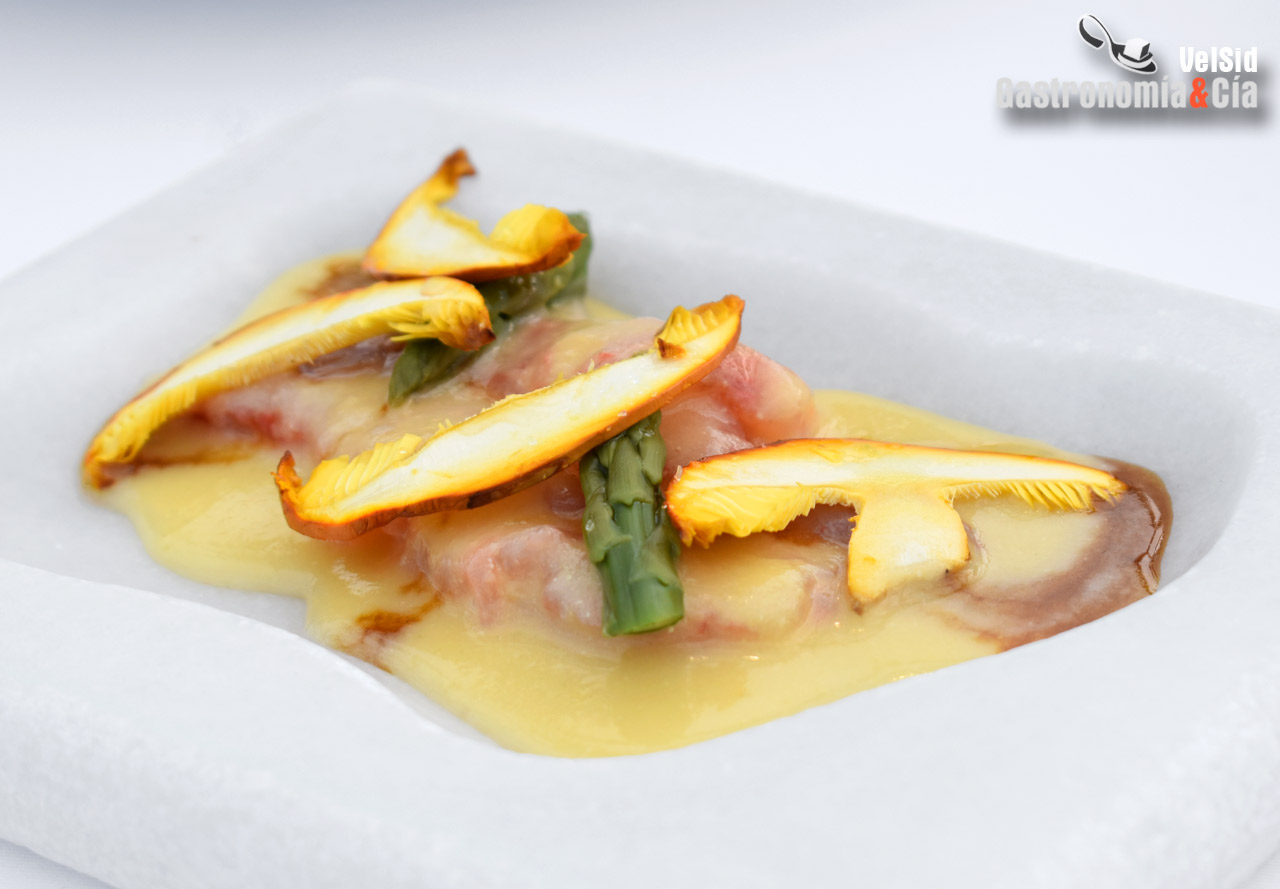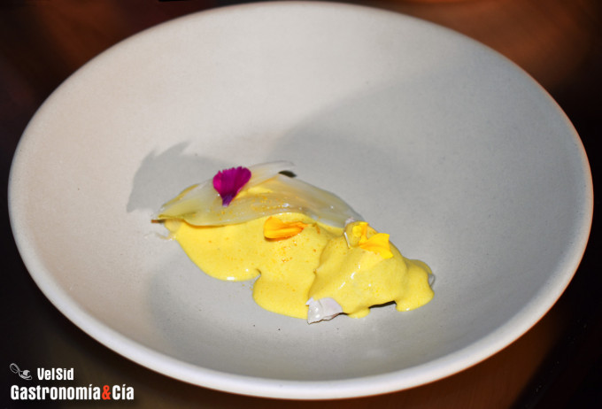 La primera es un escabeche de codorniz emulsionado con hinojo encurtido, a destacar el uso de grasa de pato con pimentón para bañar las codornices, con lo que ganan untuosidad y melosidad, y una maduración de 45 días. El escabeche lo trituran y en caso de necesidad le dan textura con Resource (un espesante que se utiliza para texturizar líquidos, os hablamos sobre sus características y usos en este post). Al final, es una salsa muy cremosa con la que napa la carne de codorniz escabechada y acompaña con el hinojo laminado muy fino. No faltan matices como los que aporta la piel de naranja y los pétalos de flores comestibles.