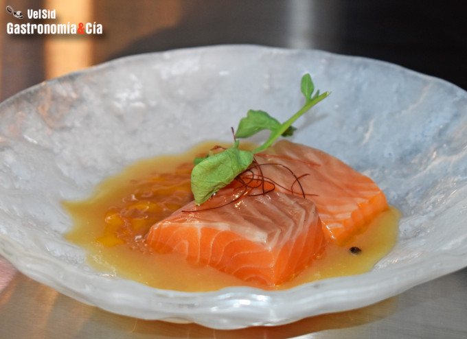 Y la trucha tiene de nuevo todo el protagonismo en este congreso dedicado a la cocina de alta montaña, y a la cocina de Óscar García llega de una piscifactoría soriana, cuyas aguas proceden de un afluente del Duero. La preparación consiste en curar la trucha con sal, azúcar y especias, como hemos hecho tantas veces con el salmón, y posteriormente la confitan a unos 45º C. Nos recuerda el chef que todos estos procesos son los que hacen por la mañana para tener todo listo a la hora del servicio.