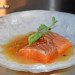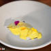 Otro componente de este plato es un caldo de jamón en el que incluye manitas y verduras, y una vez hecho y limpio, lo reduce y enriquece con un poco de nata para que gane en cremosidad. Para terminar de redondear el plato, yema pasteurizada (yemas a 60º C durante 60 minutos en el horno a vapor), praliné de ajo, miel y soja, y unos berros de agua. El emplatado, como podéis ver en la foto, es sencillo, delicado, elegante. En primer lugar se sirve un fondo de puchero de jamón, seguido de las piezas de trucha curada y confitada, la yema de huevo, el praliné de ajo, unos filamentos de pimiento (ito togarashi), los berros y unas gotas de AOVE.
