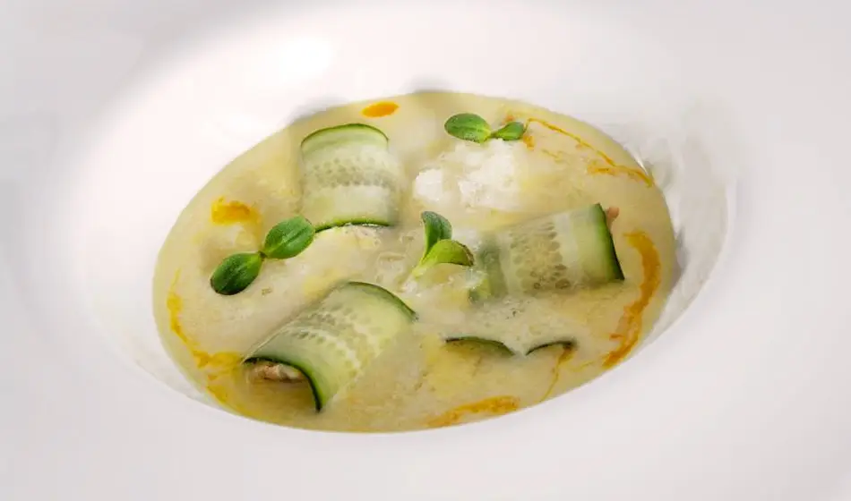 El acabado del plato de ostra y pepino se realiza con la crema de patata azafranada, verter con una jarrita en el plato sin llegar a cubrir los rollitos de ostra y pepino.