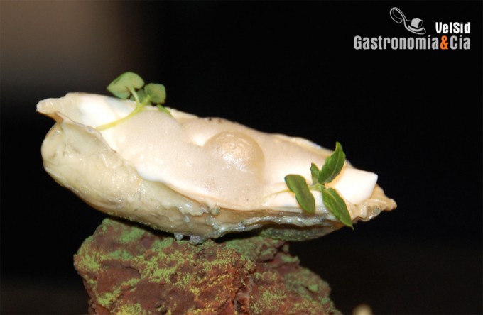 Este postre o dulce de alta pastelería se compone de una mousse de chocolate blanco, la perla se realiza con una antigua técnica de pastelería y es de vodka, además se acompaña con un granizado de champán y emulando a las rocas marinas, el famoso panettone de Paco Torreblanca. Aquí podéis ver un vídeo de la elaboración de la Ostra de plata.