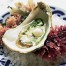 Disponer en un plato el panettone a modo de roca, espolvoreado con té matcha. Rellenar una concha de ostra con una cucharada de mousse de chocolate blanco, acomodar con sumo cuidado encima de ésta la perla de vodka, acabar con el granizado de champán. Colocar la ostra sobre la roca de panettone.