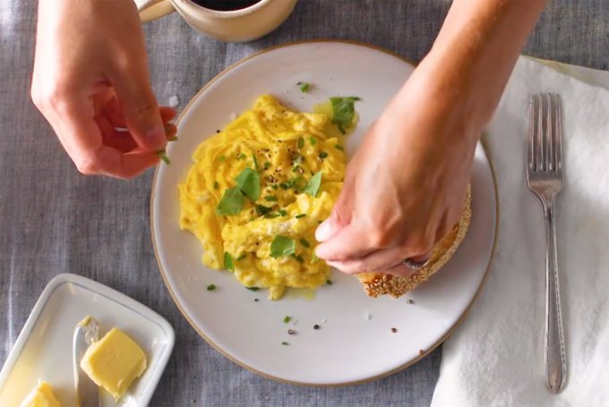 Bueno, hay muchas formas de condimentar estos huevos revueltos una vez cocinados, se pueden romper y añadir hierbas aromáticas y especias, algo de queso, jamón serrano o ibérico… lo que a cada uno le guste y dependiendo de si los va a tomar como desayuno o como parte de la comida.