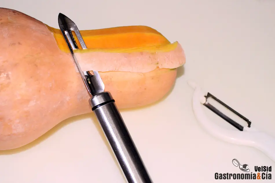 Hay calabazas butternut (Cucurbita moschata) que apenas cuesta pelarlas porque son pequeñas, tienen una piel fina… por lo que no es necesario realizar esta precocción. Puede utilizarse el cuchillo para pelarla, pero resulta mucho más práctico utilizar un pelador de hortalizas.
