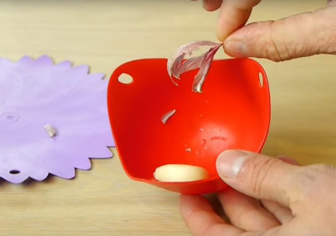 Y otro de los utensilios que se pusieron de moda hace unos años, y que parece que no a todo el mundo convencieron y ahora podrán darle otra salida, es el cestillo de silicona flexible Poachpod del que os hablamos hace unos años. Ya lo habéis visto en el vídeo, para utilizar estos dos utensilios como pelador de ajos, simplemente hay que envolver el diente y hacer rodar sobre la mesa de trabajo.