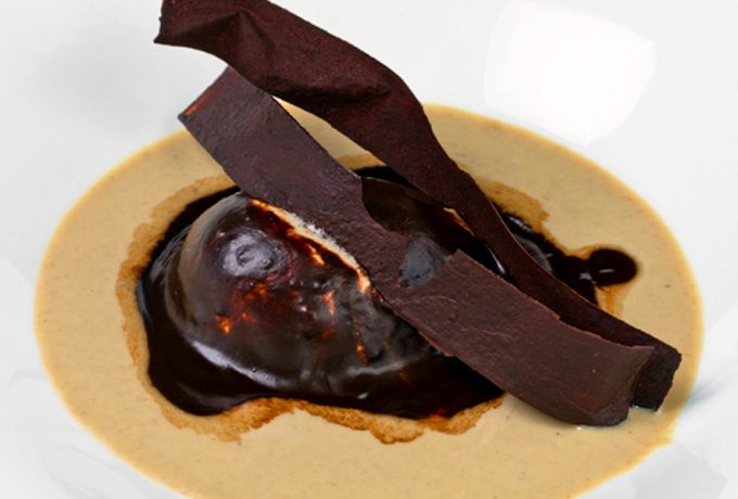 Y ¿por qué esta receta en esta inestable primavera? Pues porque es un postre frío-caliente, como se define a sí mismo con la voz vasca ‘otz-bero’, por el frío del helado de nueces artesano, y por el calor del chocolate fundido que baña el plato. El nexo de unión de estos dos elementos es un clásico de la cocina vasca, la intxaursaltsa, una crema de nueces que no tiene rival, es una verdadera delicia que todos tenéis que probar (si no lo habéis hecho ya). Hay muchas fórmulas, pero, de momento, podéis tomar nota de esta receta para preparar el postre de helado de nueces, intxaursaltsa y chocolate caliente de Andra Mari.