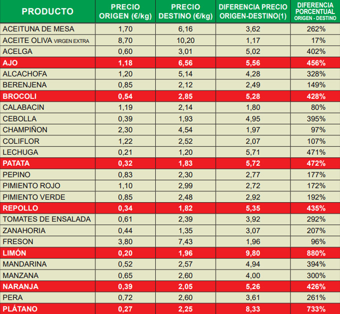 Hasta no hace mucho, COAG sólo destacaba en color rojo todos aquellos alimentos que superaban la barrera imaginaria del 500%, dando la impresión de que esa diferencia era algo normal, pero en realidad se pretendía señalar casos muy abusivos. Ahora se señalan también otros productos por superar la barrera del 400%, y es que se trata igualmente de una diferencia elevada que en muchas ocasiones no tiene sentido, porque no existe ningún motivo que pueda provocar fluctuaciones de mercado, como la falta de producto.