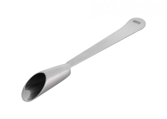 Es la pala para especias de Gefu, una especie de cuchara tubular con el mango largo, por lo que es ideal para poder coger las especias de tarros aunque sean altos y quede poca cantidad de especias (no obstante hay que tener en cuenta que el tarro se debe tumbar un poco para poder sacar la cuchara llena de especias) o de bolsas si se compran a granel y no se trasladan a un especiero.