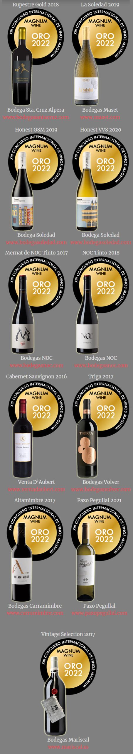 En total se han entregado una Gran Medalla de Oro, y once Medallas de Oro que están repartidas en varias zonas vitivinícolas de la geografía española. Bajo estas líneas tenéis el palmarés del Concurso Internacional de Vinos Magnum 2022, con el nombre del vino, la bodega y la marca de garantía bajo el que se ampara: