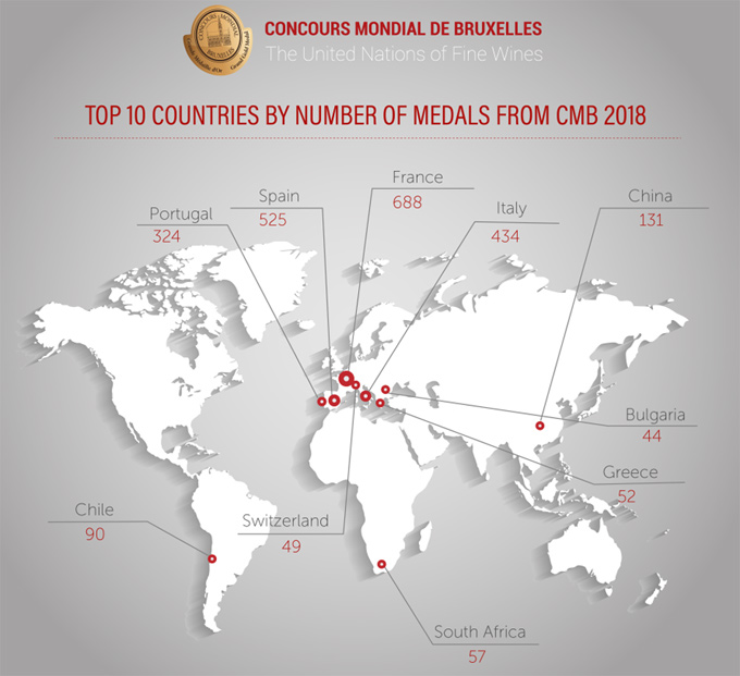 El Palmarés del Concurso Mundial de Bruselas 2018 vuelve a dejar constancia de la calidad de los vinos españoles a pesar de no ser los más premiados, por delante está Francia. Bajo estas líneas podéis ver que el país galo se ha hecho con 688 medallas, España ha conseguido 525 medallas, Italia 434, Portugal 324, China 131, Chile 90, Sudáfrica 57, Grecia 52, Suiza 49 y Bulgaria 44 medallas.