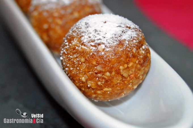Tritura hasta que todos los ingredientes estén bien mezclados y picados, puedes dejar trocitos o triturar bien fino si lo prefieres, pero es agradable en la degustación encontrar los trocitos de almendra. Añade a continuación el vino dulce y mezcla bien, hasta que tenga textura de pasta que puedas moldear para hacer las bolas.