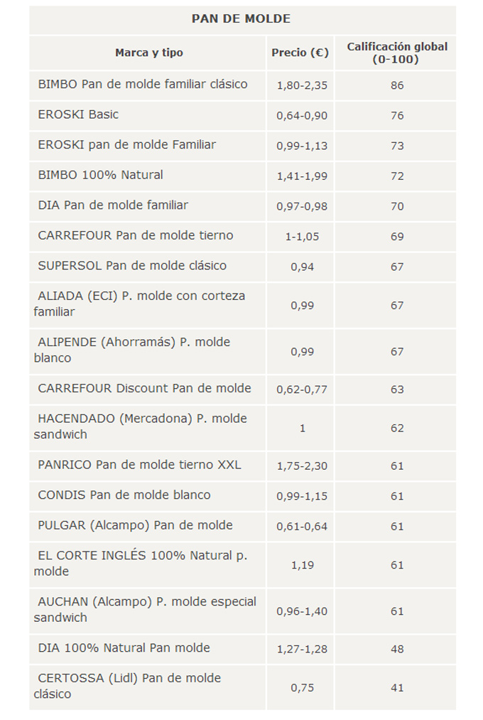 Sobre estas líneas podéis ver las marcas y tipos de pan de molde analizados, el precio y la puntuación recibida. El pan de molde que mejor calificación ha obtenido ha sido el Bimbo familiar clásico. Nos sorprende que en las dos siguientes posiciones esté el que comercializa Eroski, pues últimamente hemos visto bastante mal parados algunos de sus productos. Seguramente uno de los más vendidos es del de Hacendado, pues ya véis que está por debajo de otras marcas como Carrefour, Día, Supersol, Aliada…
