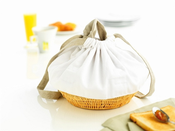 La pregunta es, ¿cómo una cesta de pan puede mantener caliente su contenido?. Como veis en la foto, se trata de una cesta de mimbre complementada con una tela (que se puede retirar para lavar) que actúa a modo de bolsa, se cierra con ayuda de las asas. En el interior se esconde un disco o piedra cerámica que se calienta antes de introducir los alimentos para proporcionarles calor.