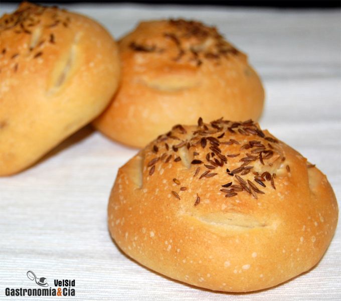 Dales forma de panecillo redondo estirando la parte superior hacia la parte inferior para crear tensión superficial, ve posando los panecillos en la bandeja del horno cubierta con tela de cocción o papel sulfurizado y úntalos con aceite de oliva, espolvorea unas semillas de comino presionando ligeramente para que se adhieran. Deja reposar de nuevo hasta que doblen su volumen y mientras tanto precalienta el horno a 200º C.