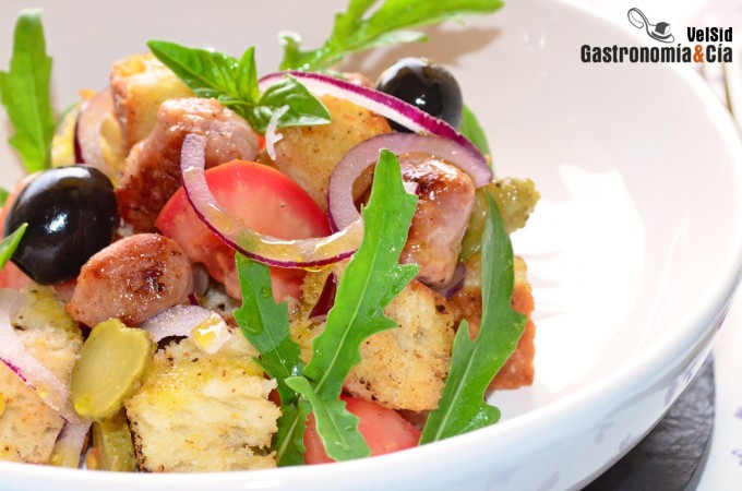 Aunque hay una panzanella clásica en la cocina Toscana, con este concepto podemos elaborar muchas variantes añadiendo al pan, base de este plato, otros ingredientes que nos proporcionen una ensalada con mucho sabor. Hoy tenemos que proponeros esta Panzanella con salchichas, un plato muy completo y rico que se puede degustar tibio o completamente frío, ya sabéis que es un plato de verano.