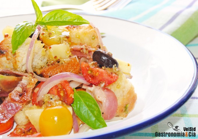 Como la mayoría de ensaladas, podemos hacer muchas variantes combinando distintos ingredientes, y como a la Panzanella se la considera una ensalada, la preparamos de muchas maneras, según nos apetezca o según la temporada. Hoy queremos proponeros la receta de Panzanella con tomates, bacon y queso tierno.