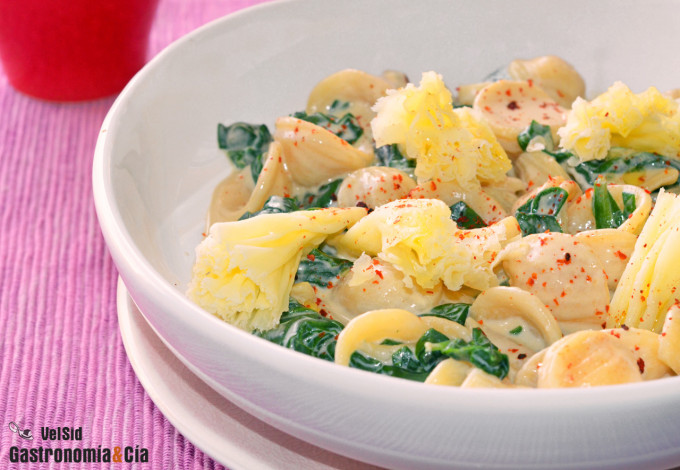 Pasta orecchiette cremosa con espinacas, kéfir y queso