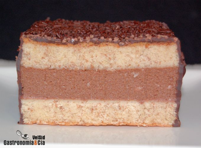 Coloca sobre una bandeja o plato cubierta con papel vegetal, el molde con la base de bizcocho, cubre con la mousse de gianduja dejando espacio para cubrir de nuevo con el bizcocho. Reserva en el frigorífico un par de horas para que la mousse coja cuerpo.