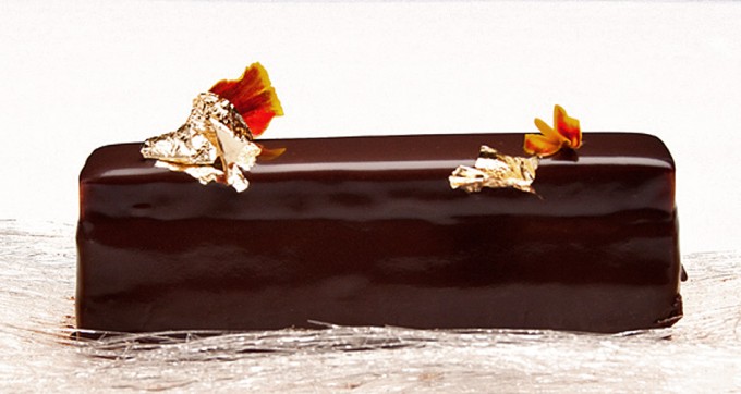 Refrigerar y desmoldar de forma que la chiboust quede arriba. Poner sobre una rejilla y bañar con el gel brillante. Una vez frío, servir sobre una cama de hilos de caramelo, acompañado con flores y toques de oro.