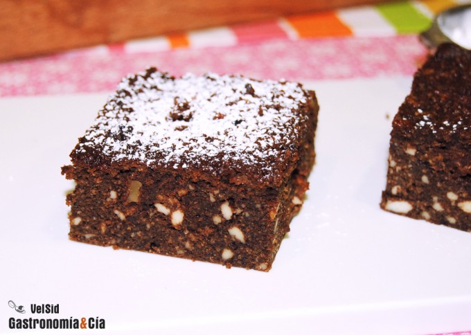 Como comentábamos, este pastel es como un brownie de chocolate y nueces, muy jugoso y mucho más ligero. Córtalo en porciones para servirlo en el desayuno, la merienda o como postre.