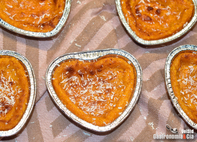 Estos pastelitos cremosos de boniato y coco son muy golosos, por lo que no necesitan nada más para acompañar, si quieres presentarlos con un contraste de color, nada mejor que un poco de coco rallado, y a disfrutar. ¡Buen provecho!