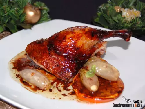 Pasados estos 20 minutos añade las chalotas y las rodajas de naranja al asado, baja la temperatura del horno a 160º C y continúa la cocción durante 30-40 minutos más, según el tamaño del pato y cómo te guste la carne de hecha. En este tiempo recuerda de vez en cuando regar el pato con el jugo de la marinada para que tome su sabor y su piel resulte brillante y caramelizada.