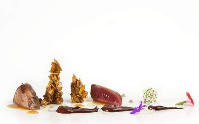 Servir las pechugas de pato troceadas acompañando con las pepitas de girasol que habremos colocado en montoncito. Terminar repartiendo a su alrededor las diferentes elaboraciones de pepitas y aderezando con la salsa.