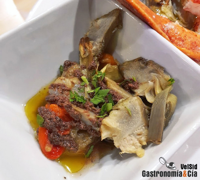 Los tres pequeños entrantes para degustar en este orden, son una Escalibada de alcachofas, bacalao desmigado y salsa de aceituna negra, el Dúo de bogavante al natural y alcachofa sobre cremoso de espárragos y yemas de erizo de mar, y una Crema de alcachofa, foie natural y polvo de pistacho.