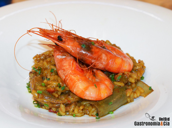 Rindiendo honor a la presentación del restaurante como arrocería, nos sorprendieron con el mejor arroz con alcachofas que recordamos haber probado, el plato se llama Degustación de arroz rojo de gambas y alcachofas, y tanto por su sabor, como por su perfume, y qué decir del punto de cocción y de la textura de las alcachofas… quizá, el plato que más nos gustó del menú.