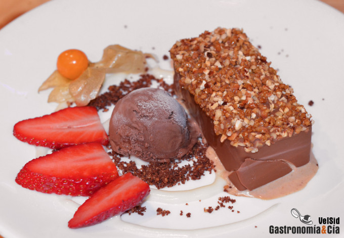 Y como somos de los que pensamos que nada mejor que el chocolate para terminar un buen menú, imaginad lo satisfechos que quedamos con el Postre de chocolate con tres texturas: Tartita caramelizada de avellanas, helado y espiral de tierra de chocolate, delicioso. Total, que cuando volvamos a hacer un arroz a Pau Restaurant, esperamos encontrar este postre en la carta.