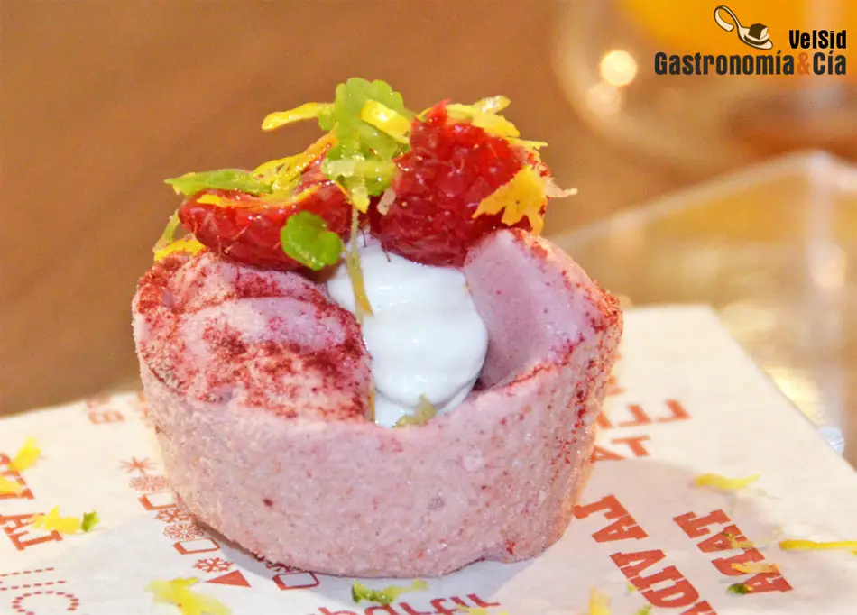 En el taller impartido por David Gil en el Fórum Coruña, hizo una demostración de la elaboración de varios postres del Tickets Restaurant de Albert Adrià, como el Queso Tickets o la Pavlova de frambuesa y helado de vainilla que veis en la foto sobre estas líneas, y la receta la podéis obtener a continuación.