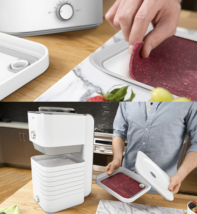 La parte superior de Peel es la licuadora, donde se introduce la fruta entera y se obtiene la pulpa necesaria para hacer los ‘fruit rolls’, y la parte inferior está compuesta de ocho bandejas antiadherentes, son las bandejas en las que se extiende la fruta y se deshidrata, siendo de un tamaño considerado ideal para hacer los rollitos de fruta individuales.