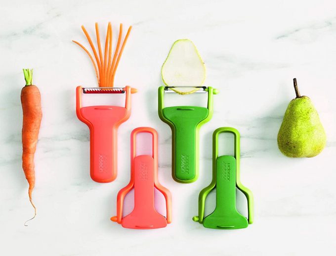 El caso es que hay muchos tipos de peladores en el mercado, pero pocos tienen un protector para la cuchilla y que, a su vez, protege a las manos de quien las mete en el cajón de los utensilios de cocina (o en el cubertero, donde se guarde). Así que nos ha gustado conocer el nuevo lanzamiento de Joseph Joseph, que ha diseñado dos nuevos utensilios para pelar y cortar vegetales que cuentan con el mencionado protector.