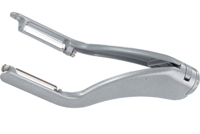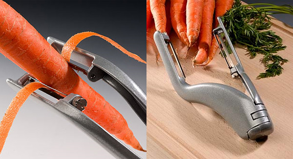 La firma alemana de accesorios de cocina Westmark ha diseñado este pelador de vegetales doble, con el que se puede hacer el doble de trabajo con un mismo movimiento. Como podéis ver en la imagen, tiene forma de pinza y en cada lado tiene una hoja o cuchilla que retirarla la piel o capa externa de los vegetales, como hacen los peladores tradicionales.