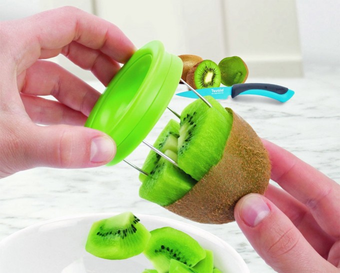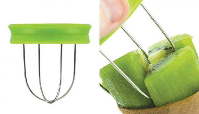 Hoy conocemos una tercera opción, aunque para ello hay que incluir un nuevo utensilio de cocina en el menaje, pero quizá a algunos de vosotros os gustará, se trata del pelador y cortador de kiwis que podéis ver en las fotos, un utensilio 2 en 1 que acaba de incluir en su catálogo la firma Tovolo.