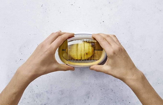 Nos ha parecido curioso este utensilio de cocina para pelar y cortar las patatas cocidas en rodajas para hacer unas patatas al gratén, unas papas aliñás o cualquier otra ensalada de patata, de las que tanto gustan en verano. Por eso, hemos pensado que era un buen momento para conocer el denominado Potato Salad Maker de Betty Bossi.