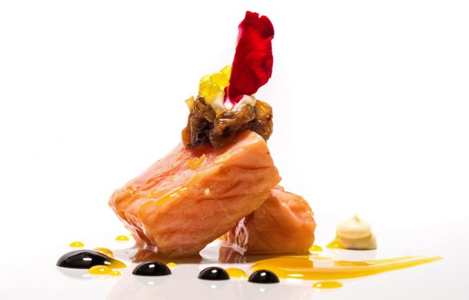 – Higado de pato y anguila ahumada del Delta con manzana asada – Maridaje: Jean León Rosé